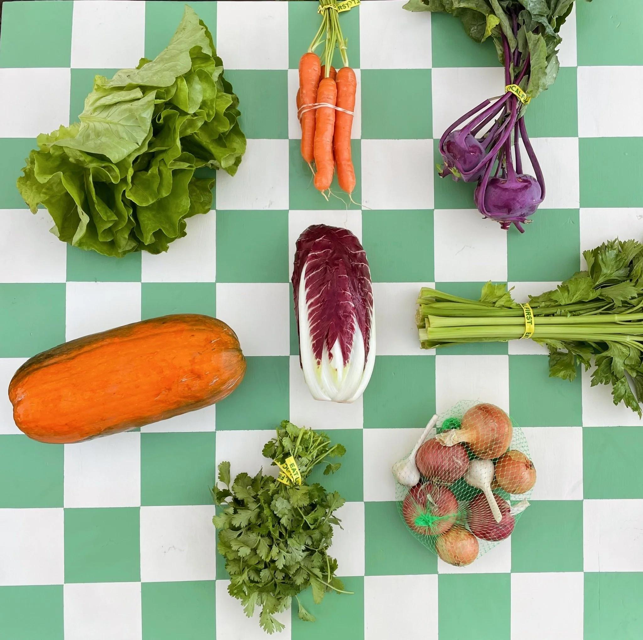 Pie Pumpkin, Butter Lettuce, Carrots, Kohlrabi, Celery, Onions & Garlic, Cilantro, Radicchio